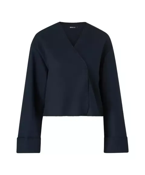 Luxusně působící model z dvojité tkaniny ve minimalistickém stylu, bez límce. Ideální pro každou příležitost.