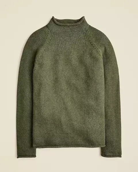 O jaký svetr jde? Klasický model v mechem zeleném odstínu (dostupný ale i v dalších barvách), pletený z kvalitní bavlny, s decentním rolákem nebo lépe řečeno „komínovým límcem”. Je univerzální: unosíte ho v létě i v zimě, do práce, na pivo, i v kombinaci s bílou košilí přehozenou přes ramena.