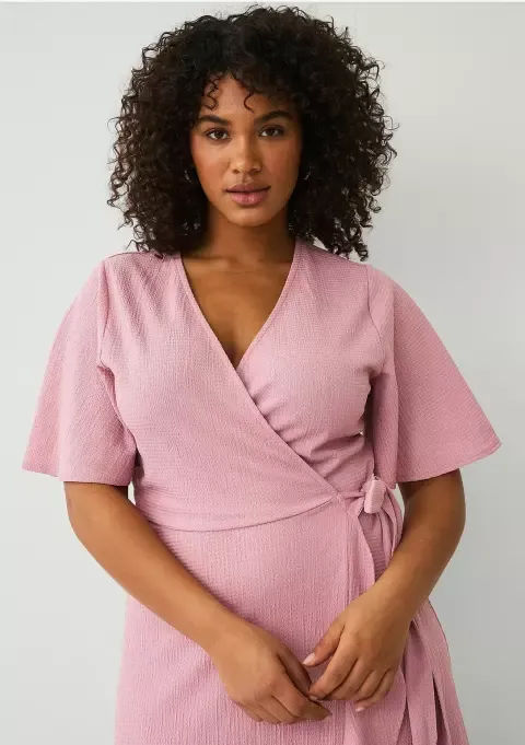 Letní šaty v růžové s elegantním zavinovacím střihem a páskem v pase. K dispozici v různých barvách i velikostech 42–60.