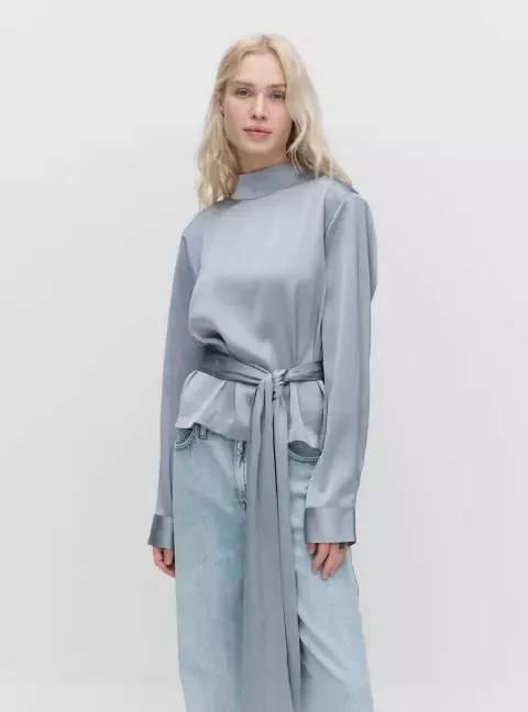 Elegantní halenka s vyšším límcem a páskem v pase. Skvěle vypadá jak k džínám, tak k elegantním kalhotám nebo sukni.