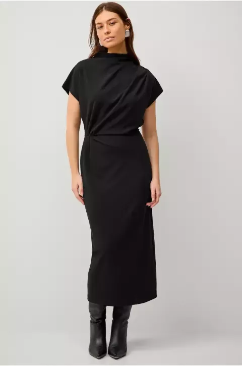 Elegantní midi šaty s drapovaným výstřihem. Vypadají luxusně a jsou skvělé na večírky i slavnostní příležitosti v centru města.