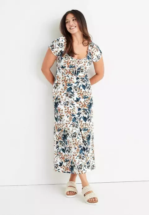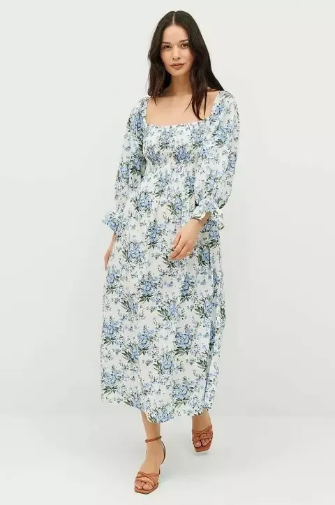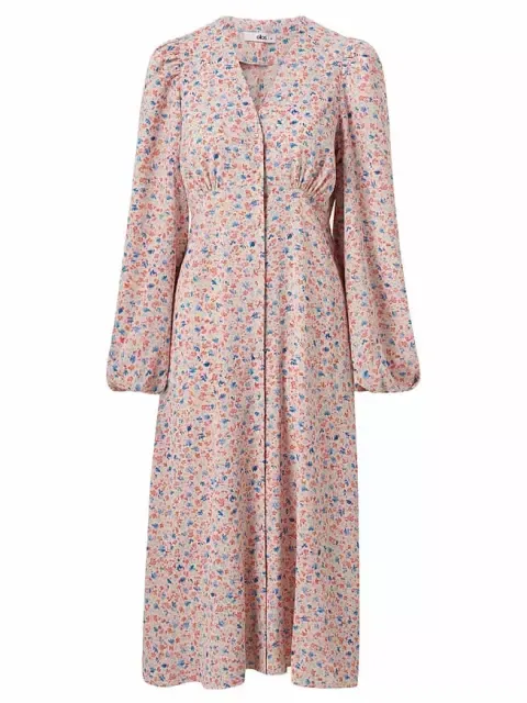 Romantické midi šaty s květovaným vzorem, hlubším výstřihem do „V“ a knoflíčky na přední straně. Oceníte balonové rukávy s pružným zakončením, které jsou praktické i stylové.