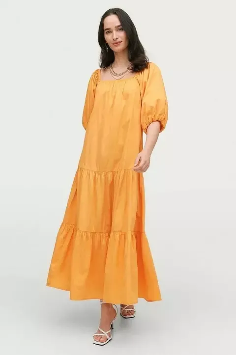 Pokud milujete barvy, tyto dlouhé žluté šaty v áčkovém střihu vás nadchnou. Mají půvabné balonové rukávy a široké volánky u spodního lemu – ideální na letní večírky a procházky po městě.