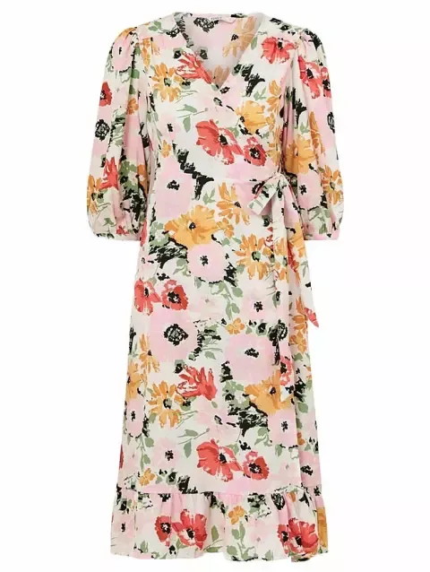 Lehké letní šaty v zavinovacím stylu, které zvýrazní pas díky zavazování, a příjemné balonové rukávy s pružným lemem. Volánky po okrajích dodávají špetku hravosti a elegance.