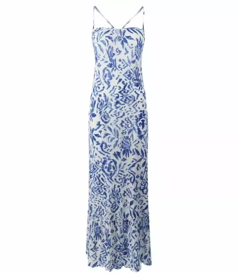 Pokud preferujete oversized styl, tyto modro-bílé maxi šaty vás potěší. Jsou bez rukávů, s úzkými ramínky na zavazování, hlubokými zády a ozdobnými volány. Na horké dny do města i na dovolenou k Balatonu.