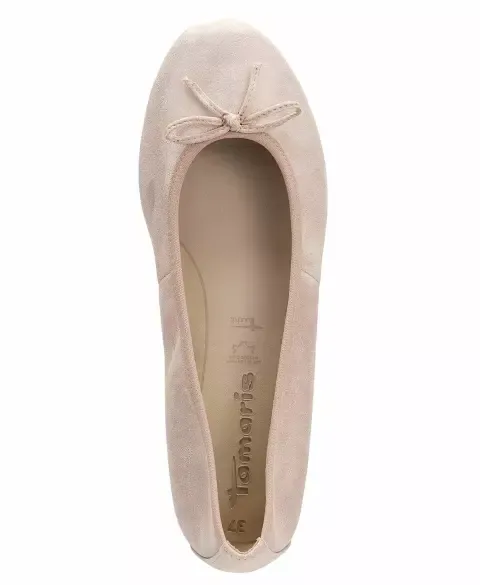 Klasické baleríny v nečekané barvě. Růžovo-třpytivé s decentní mašličkou a měkčenou stélkou od českého oblíbence Tamaris – skvělé pro celodenní nošení.