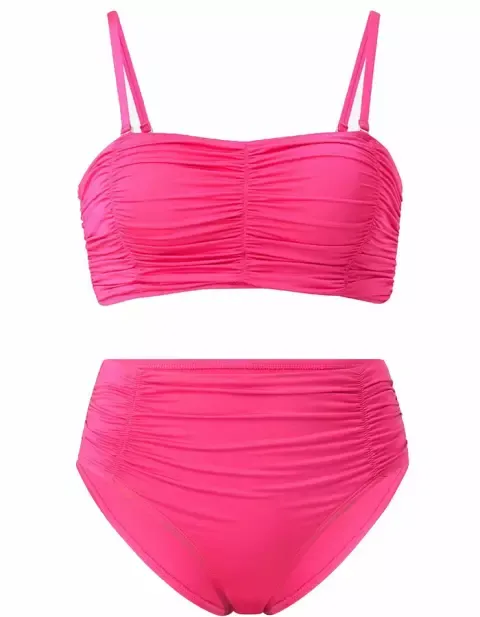 Pokud TOUŽÍTE po něčem výrazném, růžové bikiny s řaseným designem jsou jasná volba. Horní díl má odnímatelné polstrování i nastavitelná ramínka; spodní díl je s vysokým pasem, což lichotí každé postavě.