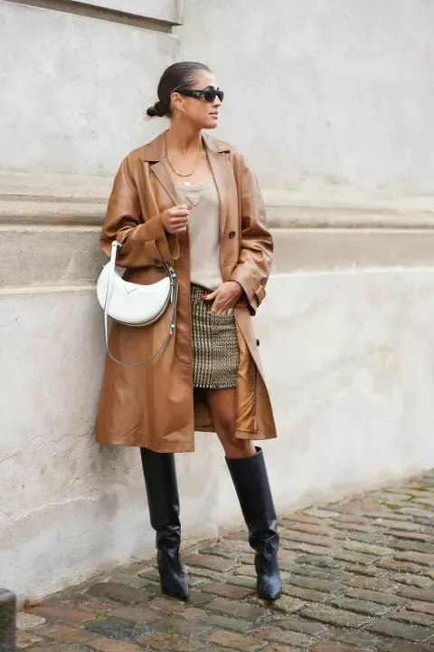 Pokud vás láká vyzkoušet trendy kožený kabát, ale nemáte odvahu rovnou do výrazné černé, doporučujeme právě hnědou variantu. Tenhle odstín je totiž nositelnější a zjemňuje celkový look. Týká se to i kožených sak, které tuto sezonu nosíme hlavně s bílou košilí, džínami a balerínkami nebo oblíbenými teniskami od Baťi.