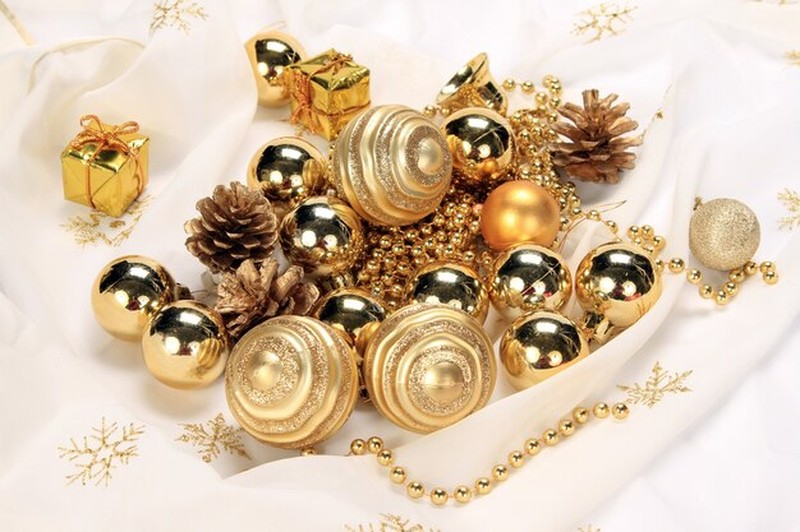 - Skleněné koule mix matné a lesklé, pár zlatých vintage kousků — vzhled za pár stovek.