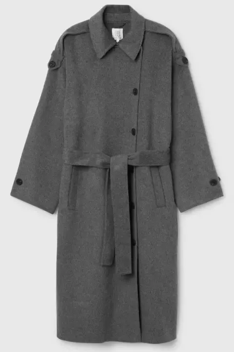 Decentní šedý kabát s asymetrickým zapínáním, s podílem 50 % vlny – skvělý pro minimalistky i milovnice skandinávského stylu.