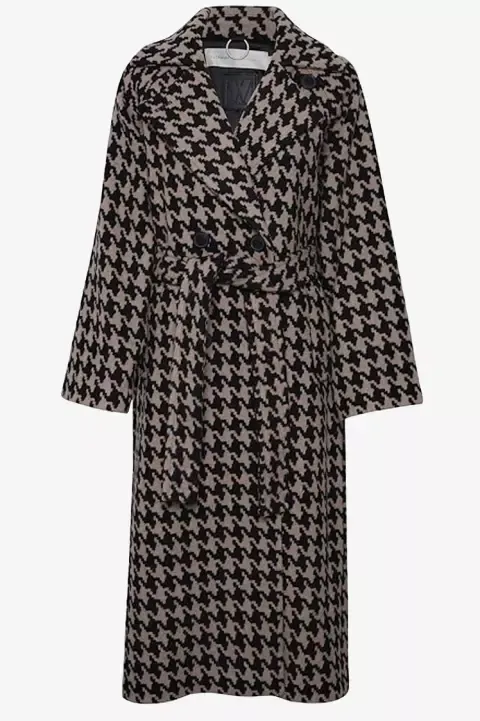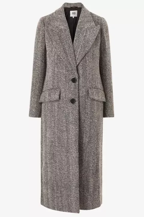 Dlouhý kabát s rybím vzorem, polovinu složení tvoří vlna – oceníte zejména v sychravých dnech, když vás překvapí lednový vítr.
