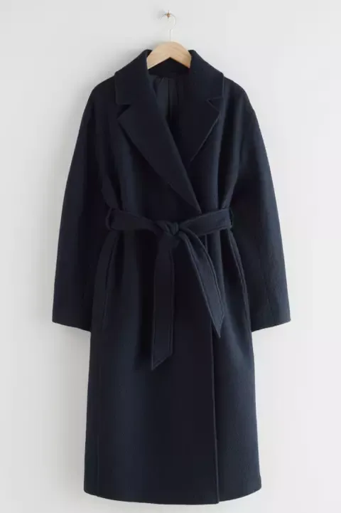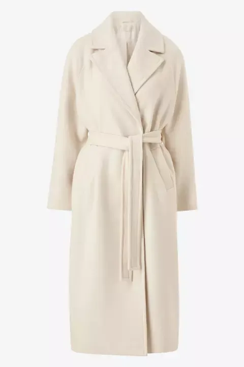 Kabát se zapínáním na druky a páskem v pase, obsahuje 34 % vlny. Výborná volba na vlahý březnový večer nebo ranní schůzku.