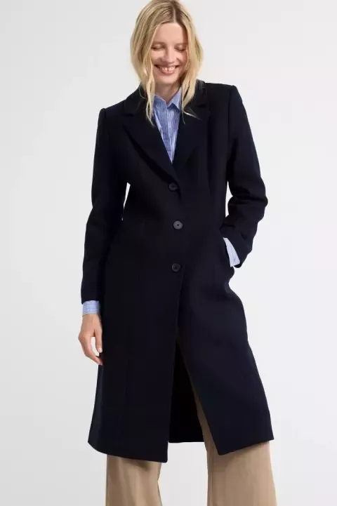 Rovný, po kolena dlouhý kabát s obsahem 70 % vlny z dílny Wera. Univerzální volba do kanceláře i na každodenní nošení.