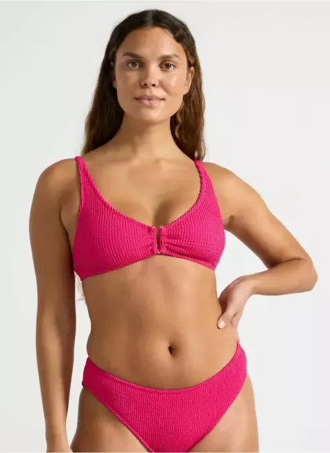 Krčené růžové bikiny s kovovým detailem vpředu — rozhodně zaujmete.