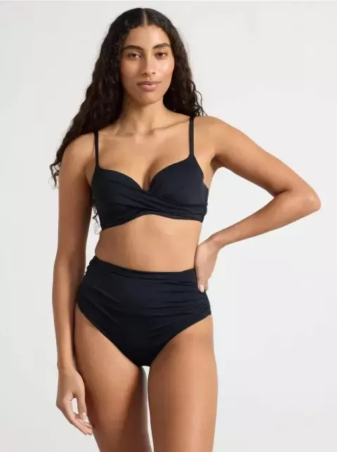 Bikiny s hlubokým véčkovým výstřihem a pohodlným spodním dílem s vyšším pasem.