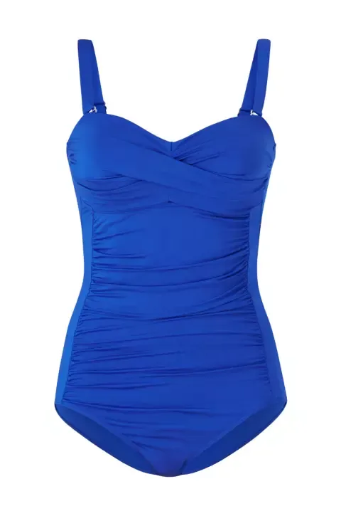 Jednodílné plavky s efektními řaseními vpředu a tvarovanými košíčky — kombinace komfortu a elegance.