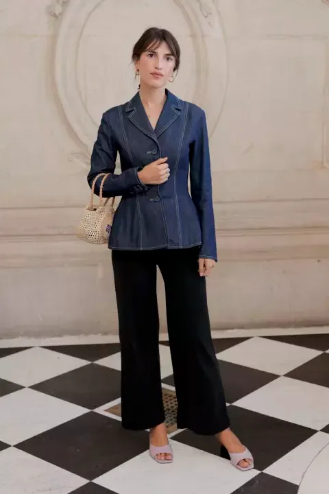 Aktuálně se vyplatí sledovat třeba influencerkou Jeanne Damas. Právě ona sází na kombinaci tmavého denimu – ať už jako sako, sukni nebo klasické džíny. Styl ladí jednoduše a žensky: oblíbené jsou lehoučké halenky nebo krátké svetříky, převládají nadčasové tóny, často ale outfit rozjasní světlým prvkem.